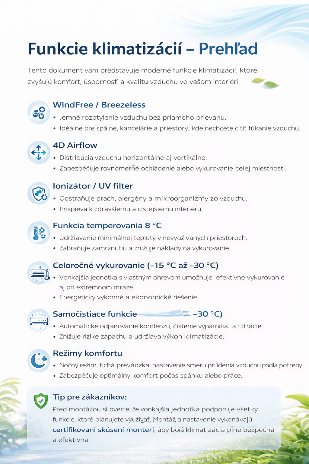 Prehľad najčastejších funkcií klimatizácií nájdete v priloženom dokumente Funkcie klimatizácií.